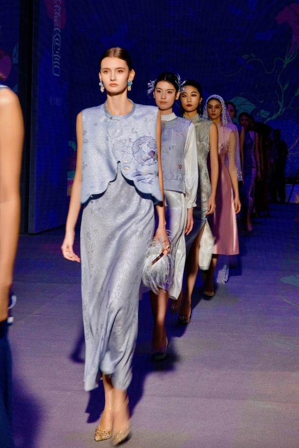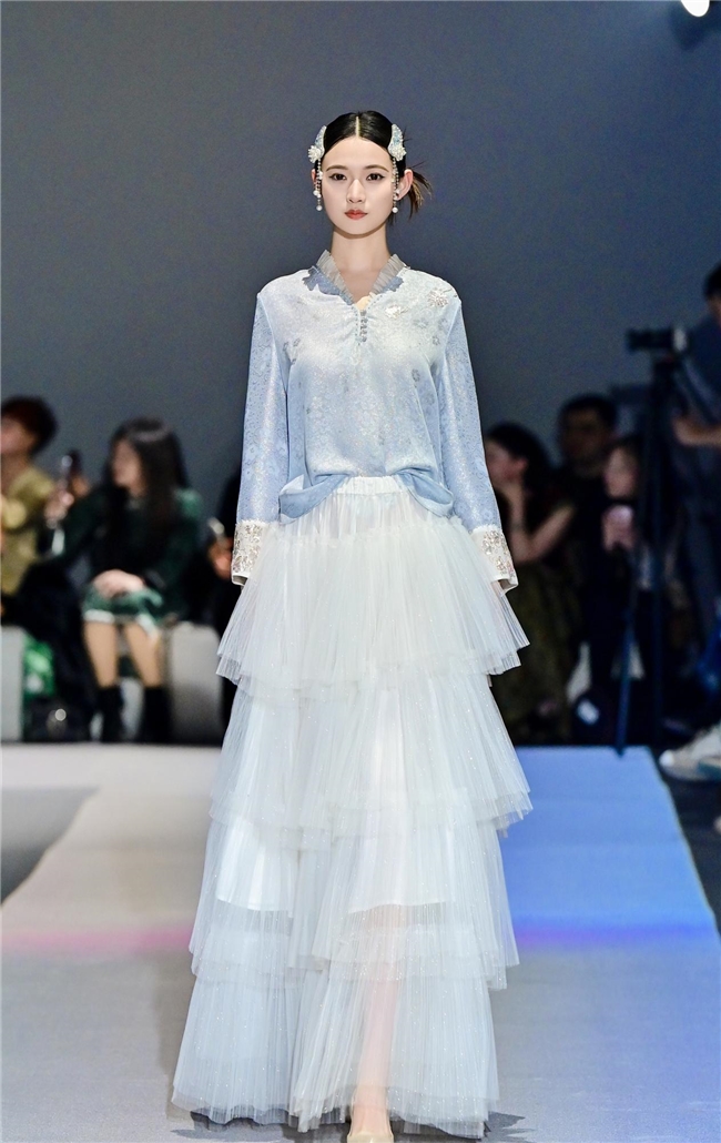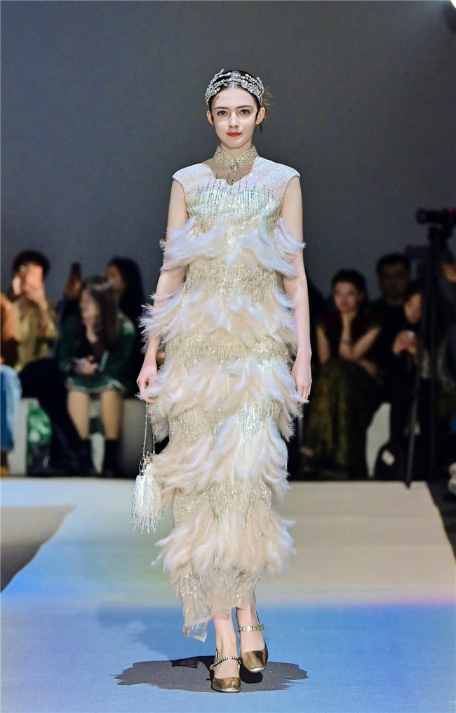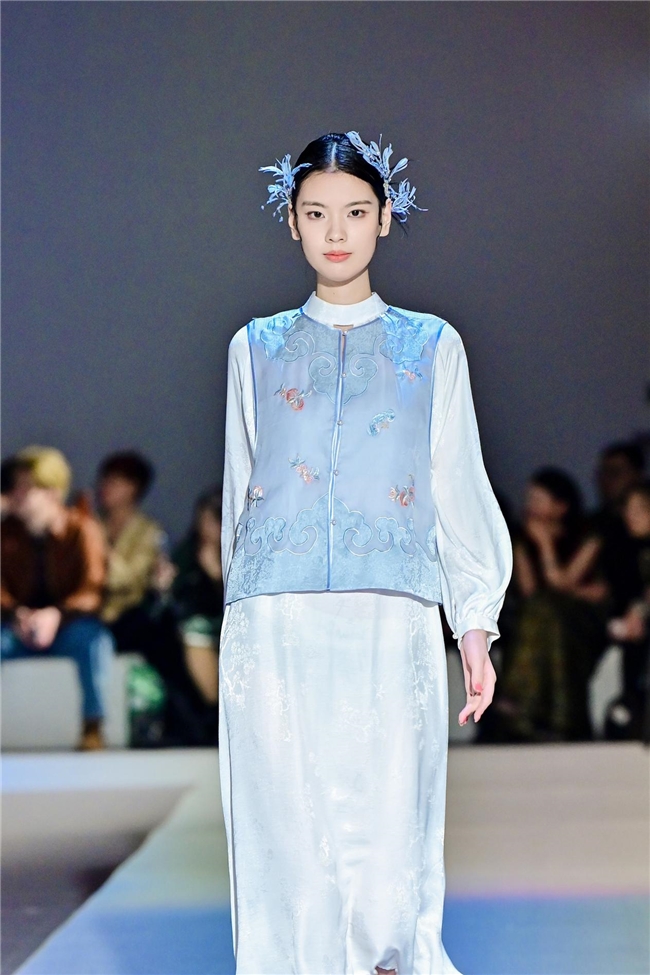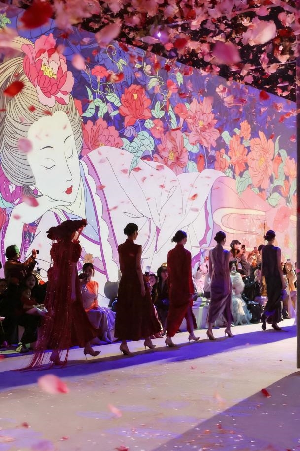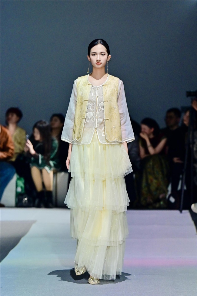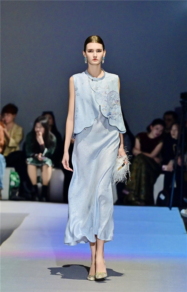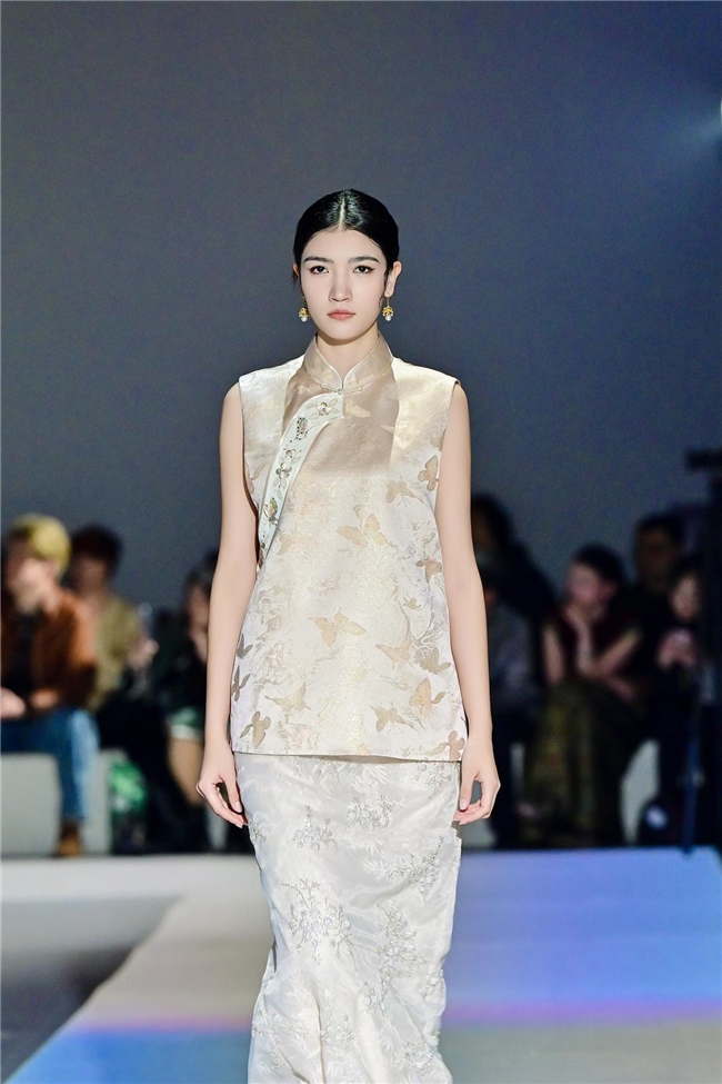 本场发布会主题“东风第一枝”,寓意春信初至、风尚先声,象征品牌在新一季中再度引领国风美学的焕新表达。本次大秀集中呈现了“非遗大师”、“职场女神”、“东方嫁衣”等多个经典系列,“青云出岫”、“庄周梦蝶”、“霓裳羽衣”等凝练诗意的文化元素,被巧妙融入本季设计之中,以服装这一载体,意象化地演绎当代人心中轻灵雅致的非遗新中式美学,深刻阐述“诗意”与“传承”的融合力量。