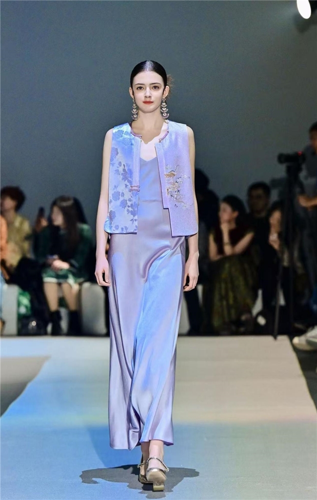 在面料与工艺层面,荷言HEYEN始终秉持将中国传统丝织品融入当代生活的初心,全方位打造当代女性的东方品质衣橱。本季采用非遗缂丝、漳绒、宋锦、蜀锦、花罗等珍贵丝织面料,并辅以手绘、烫金、烫钻、压褶、串珠、非遗苏绣、非遗盘扣等精湛工艺,生动诠释品牌“实穿的艺术品”这一定位。